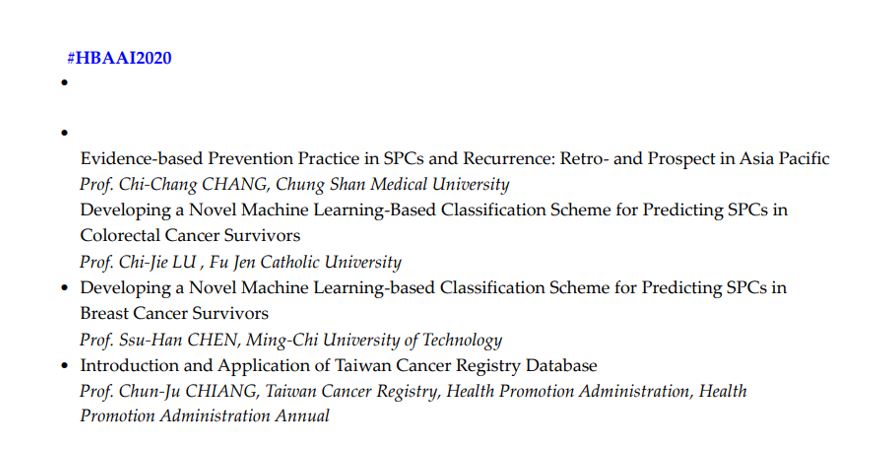 • Chi-Chang Chang*, T-H Huang, P-W Shueng, S-H Chen, C-C Chen, C-J Lu, Y-J Tseng Developing a Stacked Ensemble-based Classification Scheme to Predict Second Primary Cancers in Head and Neck Cancer Survivors. Int J Environ Res Public Health. 2021, 18, 12499. (SCI; SSCI)
